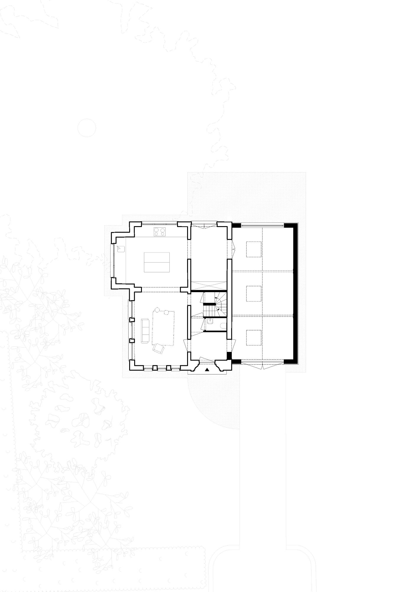 The remarkable tree on site is fully preserved; all structural works are confined to the garage footprint to protect its root system.
